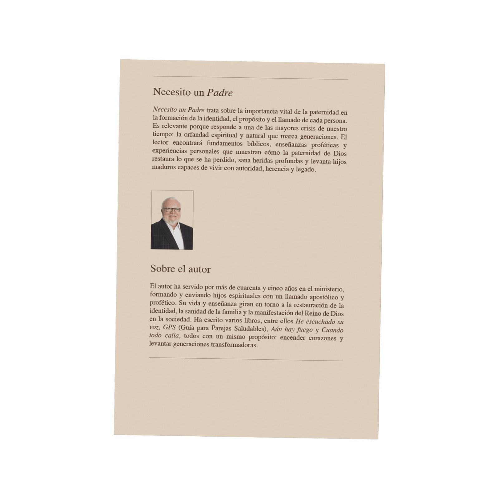 Necesito un Padre aborda la importancia vital de la paternidad en la formación de la identidad, el propósito y el llamado de cada persona. En una generación marcada por la orfandad espiritual y emocional, este libro revela el poder restaurador de conocer a Dios como Padre. A través de fundamentos bíblicos, enseñanzas proféticas y vivencias personales, el autor muestra cómo la paternidad de Dios sana lo quebrado, afirma el valor de los hijos y despierta la herencia espiritual que estaba dormida. Cada página invita a descubrir que la verdadera paternidad no se impone, sino que se imparte con amor, ejemplo y presencia.